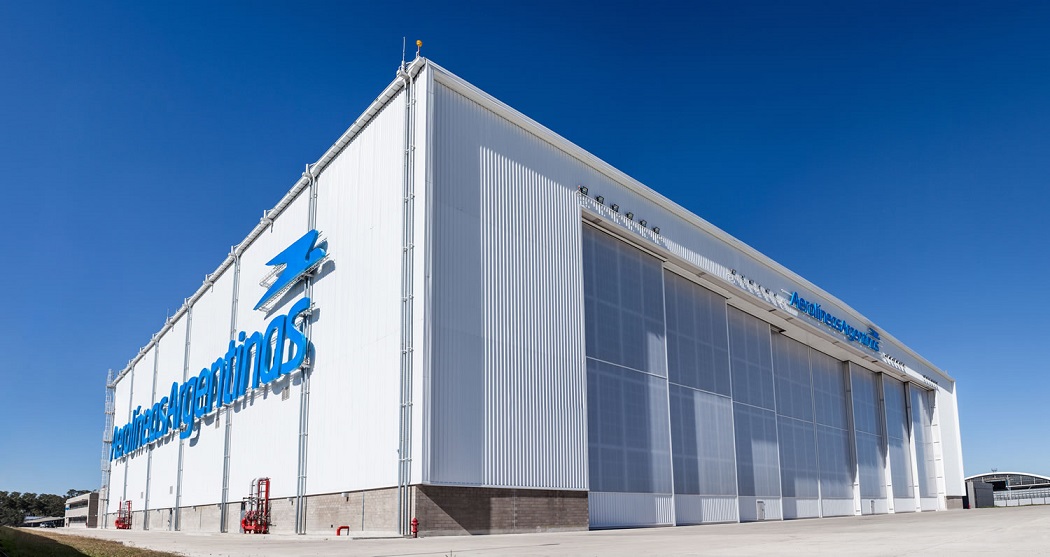 Ubicado en Ezeiza, Argentina y diseñado ASZ arquitectos y MZM arquitectos, Aerolíneas Argentinas ha puesto en funcionamiento uno de los hangares más modernos de la región, con una superficie de 12.017m2, y un sistema de puentes grúa que barren el área central del hangar cubriendo el fuselaje de la aeronave y sus laterales.